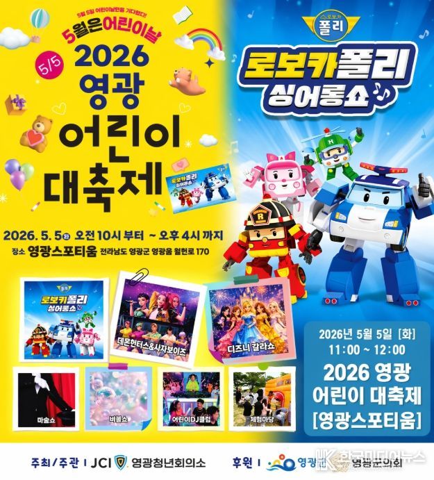 [ 한국미디어뉴스 이종철 기자 ] 영광청년회의소(JC)가 주최·주관하고 영광군·영광군의회가 후원하는 ‘2026년 어린이 대축제’가 오는 5월 5일 104회 어린이날을 맞아 대대적으로 개최된다.