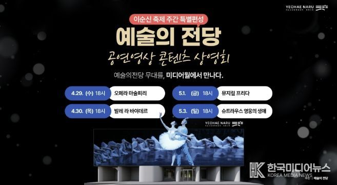 특히 ‘제65회 아산 성웅 이순신축제’ 기간(4/28~5/3)에는 특별 상영이 진행된다. 4월 29일 오페라 '마술피리', 4월 30일 발레 '라 바야데르', 5월 1일 뮤지컬 '프리다', 5월 3일 음악회 '영웅의 생애' 등 대표 작품들이 연이어 상영될 예정이다.