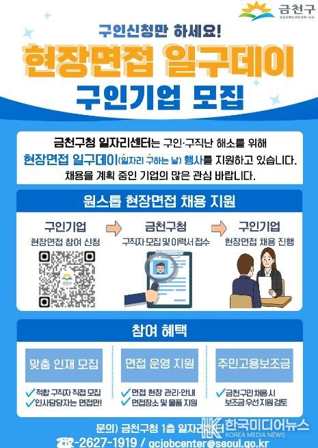 [ 한국미디어뉴스 이원영 기자 ] 금천구는 구인·구직난을 해소하고, 기업의 원활한 채용을 지원하기 위해 ‘현장면접 일구데이’ 참여 기업을 상시 모집한다고 밝혔다.
