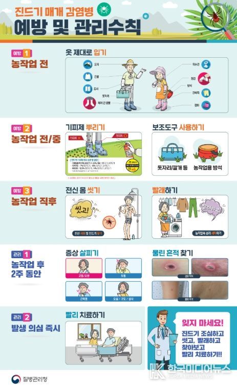 진드기 매개 감염병 예방 수칙으로는 ▲야외 활동 시 긴 소매, 긴 바지, 모자, 장갑, 장화 등을 착용하여 피부 노출 최소화 하기 ▲기피제 사용하기 ▲휴식 시 돗자리 사용하기 ▲ 야외 활동 후 즉시 샤워 및 세탁하기 등이 있다.