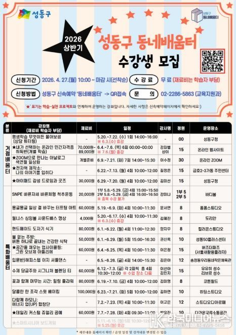 [ 한국미디어뉴스 이원영 기자 ] 서울 성동구가 올해 약 3,800만 원의 예산을 투입해 주민 주도형 평생학습 생태계를 조성하는 ‘2026년 성동구 동네배움터’ 운영에 본격적으로 나선다고 밝혔다.