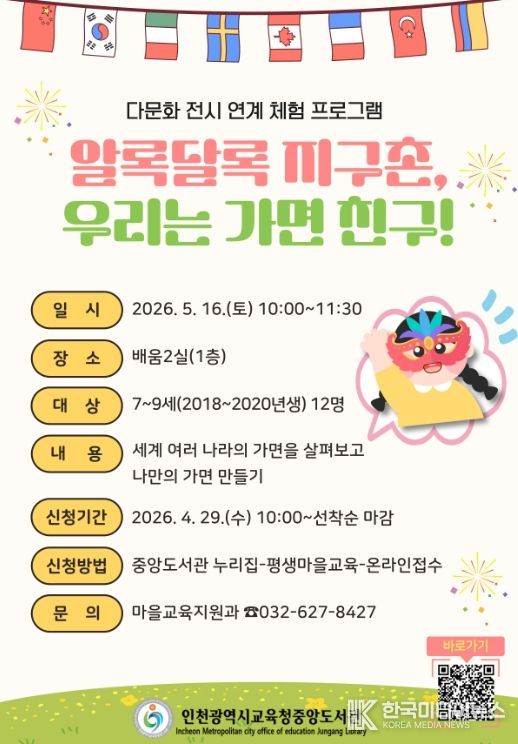 [ 한국미디어뉴스 이원영 기자 ] 인천광역시교육청중앙도서관은 5월 16일 다문화 전시 연계 체험 ‘알록달록 지구촌, 우리는 가면 친구!’를 운영한다.
