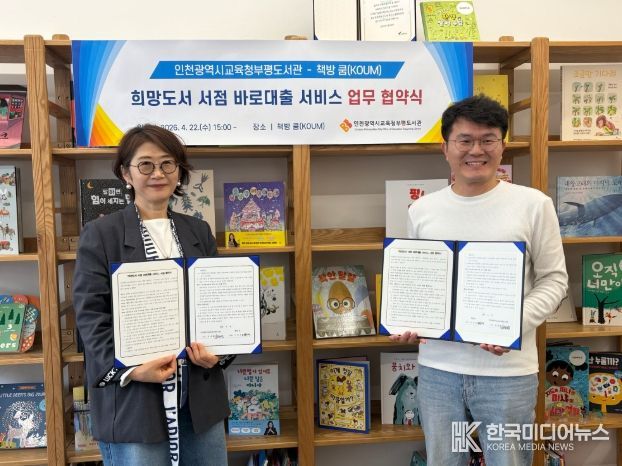 [ 한국미디어뉴스 이원영 기자 ] 인천광역시교육청부평도서관은 지난 22일 '책방 쿰'과 ‘희망도서 서점 바로대출 서비스’ 업무협약을 체결했다.
