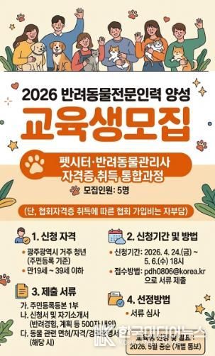 [ 한국미디어뉴스 이종철 기자 ] 광주광역시는 반려동물 산업 성장에 대응하고 전문역량을 갖춘 인재 양성을 위한 ‘2026년 반려동물 전문인력 양성교육’을 실시한다.