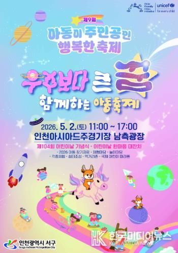 [ 한국미디어뉴스 이기선 기자 ] 인천 서구는 제104회 어린이날을 맞이하여 오는 5월 2일 오전 11시부터 오후5시까지 인천아시아드주경기장 남측광장에서 제9회 아동이 주인공인 행복한 축제를 개최한다.