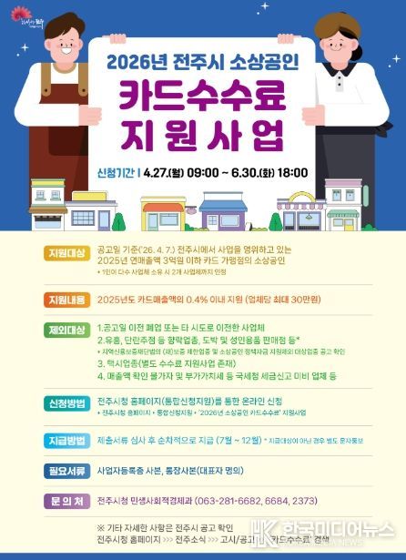 시는 오는 27일 09시부터 6월 30일 18시까지 전주시 소상공인을 대상으로 2025년도 카드매출액의 0.4% 이내, 업체당 최대 30만 원까지 지원하는 ‘2026년 소상공인 카드수수료 지원사업’ 신청을 접수한다.