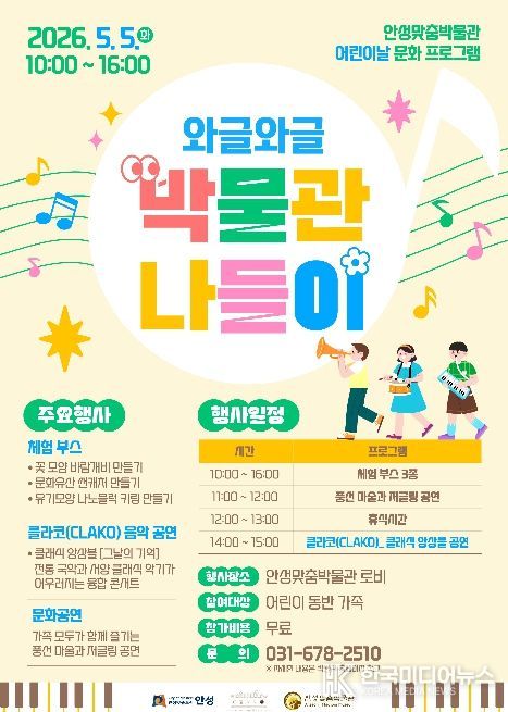 [ 한국미디어뉴스 이보영 기자 ] 안성맞춤박물관은 오는 5월 5일 어린이날을 맞아, 온 가족이 함께 즐길 수 있는 문화 프로그램 ‘와글와글 박물관 나들이’를 개최한다고 밝혔다.