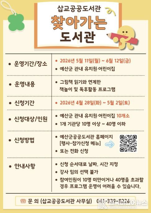 [ 한국미디어뉴스 이원영 기자 ] 예산군 삽교공공도서관은 5월 11일부터 6월 12일까지 관내 유치원·어린이집을 대상으로 ‘찾아가는 도서관’ 프로그램을 운영한다.