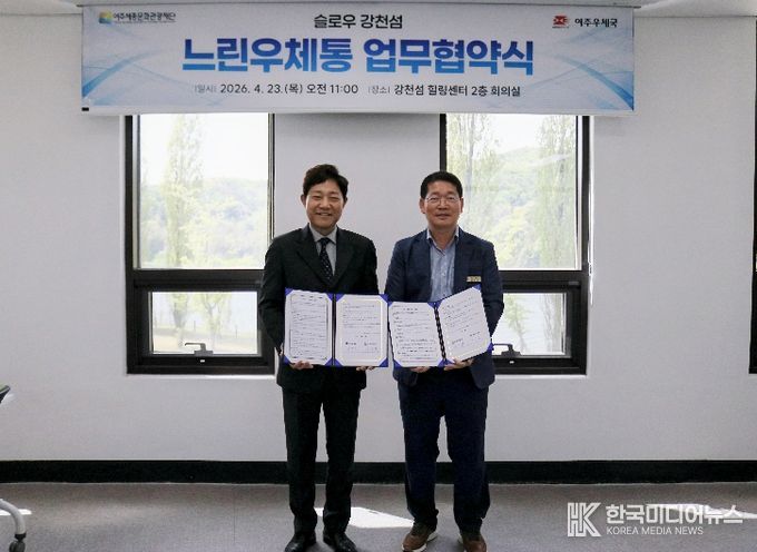 [ 한국미디어뉴스 이원영 기자 ] 여주세종문화관광재단과 여주우체국은 4월 23일 강천섬 힐링센터에서 ‘슬로우 강천섬 느린우체통 업무협약(MOU)’을 체결했다. 빠르게 흘러가는 일상 속에서 잠시 걸음을 멈추고, 소중한 사람에게 미래의 마음을 전할 수 있는 감성 관광콘텐츠를 공동으로 운영하기 위해서다.