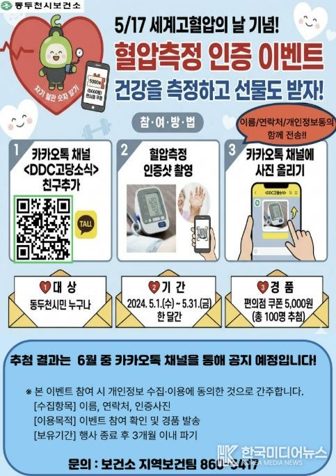 [ 한국미디어뉴스 김서안 기자 ] 동두천시보건소는 오는 5월 17일 세계고혈압의 날을 기념해 시민들의 심뇌혈관질환 예방과 건강관리 실천을 유도하고자 ‘혈압측정 인증 이벤트’를 운영한다고 밝혔다.