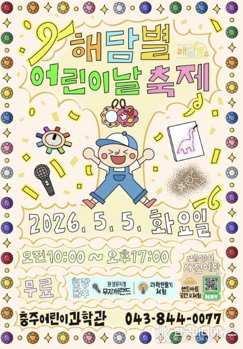 [ 한국미디어뉴스 김풍옥 기자 ] 충주어린이과학관은 오는 5월 5일 어린이날을 맞아 연나이 8세 이하 어린이와 동반 가족을 대상으로 ‘해담별 어린이날 축제’를 무료로 개최한다고 밝혔다.