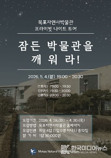 [ 한국미디어뉴스 이종철 기자 ] 목포자연사박물관은 오는 5월 4일 오후 7시부터 8시 30분까지 야간 특별 프로그램인 ‘프라이빗 나이트 투어’를 운영한다.