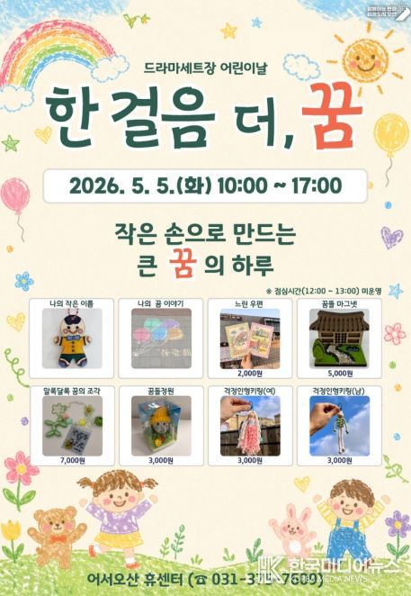 이번 프로그램은 어린이날을 기념해 아이들이 다양한 체험활동을 통해 자신의 생각과 꿈을 자유롭게 표현할 수 있도록 마련됐다. 드라마세트장과 어서오산 휴센터(休) 공간을 활용해 창의적이고 감성적인 체험 콘텐츠를 선보일 예정이다.