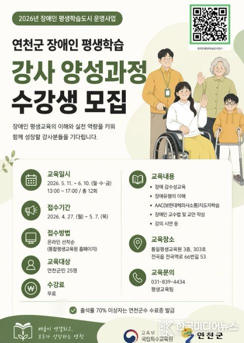 [ 한국미디어뉴스 김서안 기자 ] 연천군은 교육부 국립특수교육원이 주관하는 '2026년 장애인 평생학습도시 운영 지원사업' 공모에 선정됨에 따라 장애인 평생교육 현장형 강사 양성 과정을 운영한다.