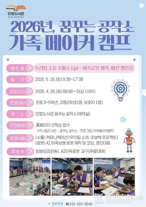 [ 한국미디어뉴스 김서안 기자 ] 구리시 인창도서관‘꿈꾸는 공작소’는 오는 5월 16일 초등학생 자녀와 보호자가 함께 참여해 가족 간 유대감을 높이고 인공지능을 체험하는 '우리 팀 소통 주파수 Up! : 이족로봇 제작, 미션 챌린지' 가족 메이커 캠프를 운영한다고 밝혔다.