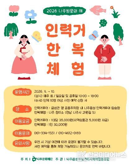 나주문화재단은 ‘2026 나주방문의 해’를 맞아 인력거투어와 한복체험 프로그램을 오는 10월까지 운영한다고 27일 밝혔다.