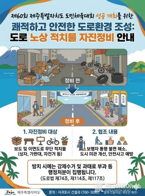 [ 한국미디어뉴스 이원영 기자 ] 서귀포시는 2026년 개최되는 4개 주요 체전에 대비하여 방문객과 시민들에게 안전하고 쾌적한 도로 환경을 제공하기 위해 ‘노상적치물 집중 정비’를 본격 추진한다고 밝혔다.