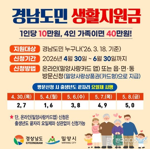 [ 한국미디어뉴스 최정화 기자 ] 경남 밀양시는 오는 4월 30일부터 시민 생활 안정을 지원하기 위한 ‘경남도민 생활지원금’ 신청을 받는다고 밝혔다.