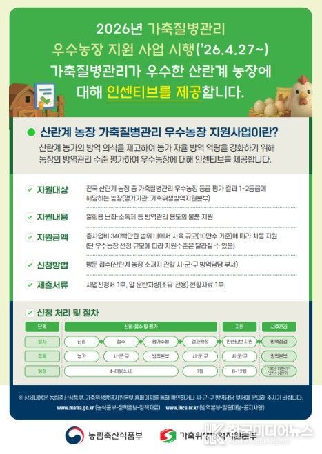 [ 한국미디어뉴스 이원영 기자 ] 농림축산식품부는 축산농가의 방역역량을 강화하고 가축전염병 발생을 사전 예방하기 위해 '가축질병관리 우수농장 지원사업'을 2026년 4월부터 본격 추진한다고 밝혔다.