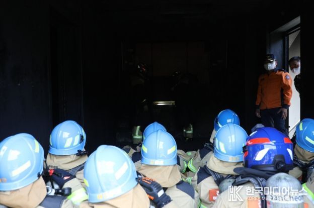 지휘부는 개인안전장비를 착용하고 실물화재 교육시설 내부에 진입해 가연성가스발화(FGI), 플래시오버(Flashover) 등 고위험 화재 이상현상을 체감하며, 고도화된 훈련 과정의 실효성과 현장 지휘 전술 운용 절차를 재점검했다.
