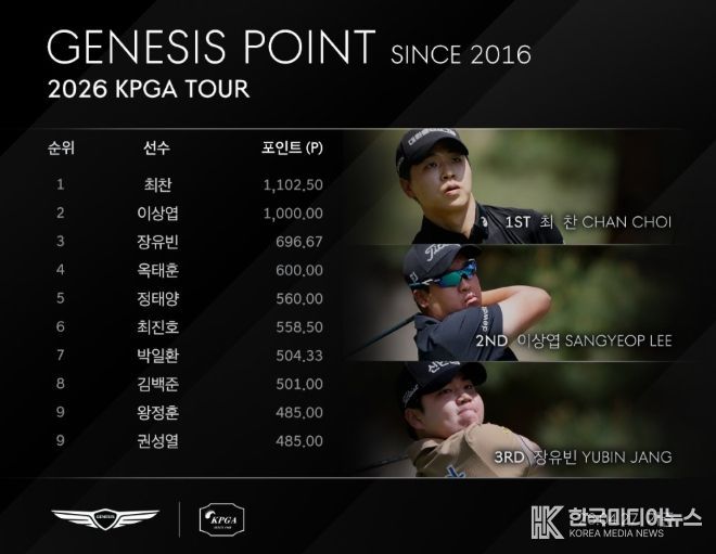 최찬은 ‘2026 우리금융챔피언십’에서 최종합계 13언더파 271타로 우승해 제네시스 포인트 1,000 포인트를 추가한 1,102.50 포인트로 단숨에 제네시스 포인트 1위에 올라섰다. 최찬이 제네시스 포인트 1위에 위치한 것은 2022년 투어 입성 이후 최초다.