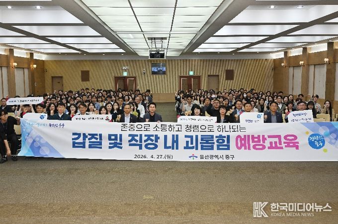 [ 한국미디어뉴스 이보영 기자 ] 울산 중구가 4월 27일 오후 2시 중구청 대회의실에서 직원들을 대상으로 ‘2026년 갑질 및 직장 내 괴롭힘 예방교육’을 실시했다.