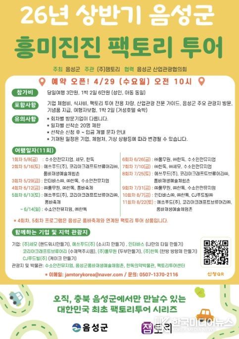 팩토리투어 예약은 4월 29일 오전 10시부터 가능하며 상세한 정보와 예약 방법은 음성군 SNS와 음성군청 문화관광 누리집을 참고하면 된다.