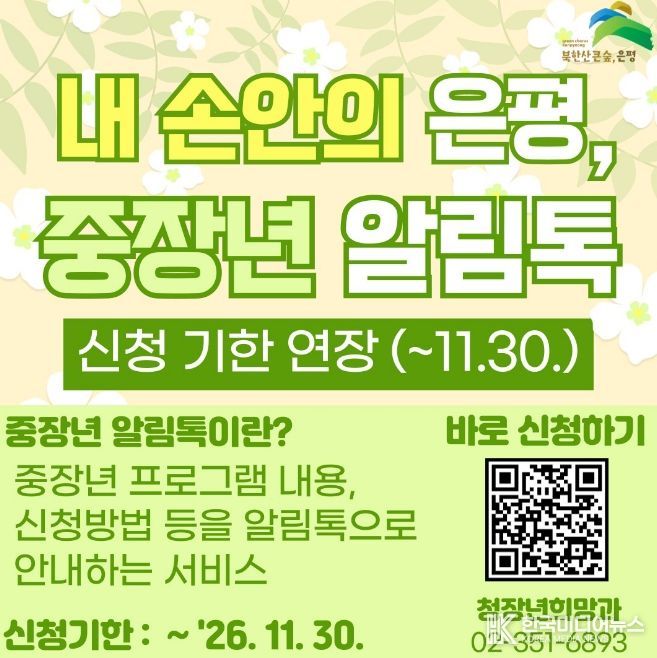 [ 한국미디어뉴스 이보영 기자 ] 서울 은평구는 중장년층의 정보 접근성을 높이고 프로그램 참여 기회를 확대하기 위해 ‘내 손안의 은평, 중장년 알림톡’ 서비스 신청 기간을 연장한다고 밝혔다.