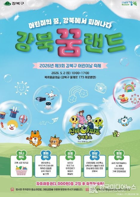 올해로 3회를 맞는 이번 축제는 ‘어린이의 꿈, 강북에서 피어나다. 강북 꿈 랜드’를 주제로 열린다. 북서울꿈의숲 서문광장, 볼프라자, 창포원, 청운답원 일대가 거대한 테마파크로 변신해 다양한 즐길 거리를 선보일 예정이다.