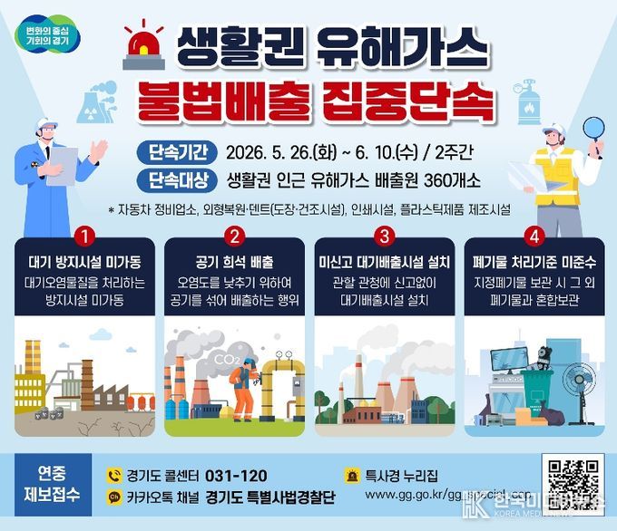 [ 한국미디어뉴스 김일규 기자 ] 경기도 특별사법경찰단이 5월 26일부터 6월 10일까지 2주간 주거지·학교·병원 등 생활권 인근 지역의 유해가스 배출 사업장을 대상으로 불법행위를 집중단속 한다.
