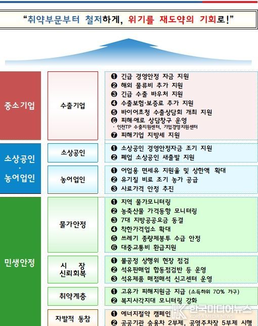 ▲중동 수출 피해기업 지원 ▲소상공인·농어업인 지원 ▲민생 안정 등 3대 분야 25개 세부사업으로 구성된 이번 대책은 지난 14일 발표한 ‘인천형 민생지원 추경’과 연계해 시너지 효과를 낼 것으로 보인다.