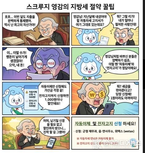 [ 한국미디어뉴스 이원영 기자 ] 청양군이 스마트폰 환경에 익숙한 군민들을 위해 친숙한 캐릭터를 활용한 웹툰 ‘스크루지 영감의 지방세 절세 꿀팁’을 제작하고, 자동이체 및 전자고지 신청 독려에 나섰다.