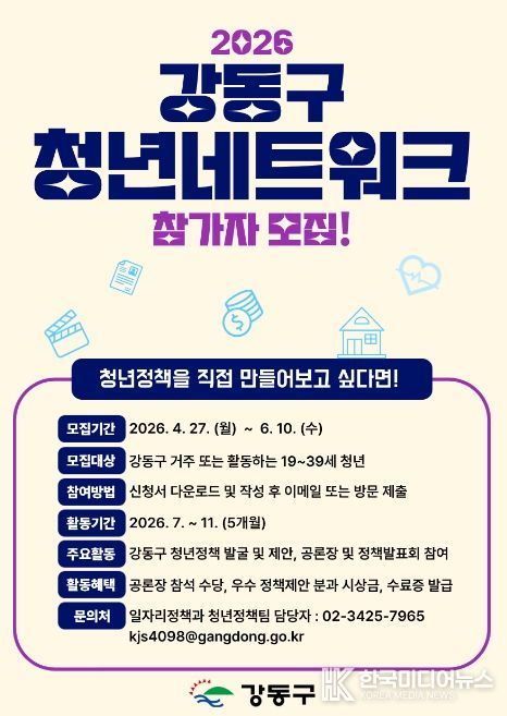 [ 한국미디어뉴스 이원영 기자 ] 서울 강동구는 ‘2026년 강동구 청년네트워크’ 참여자를 모집한다고 밝혔다. 청년네트워크는 청년들이 직접 의제를 발굴하고 정책을 제안하는 사업이다.