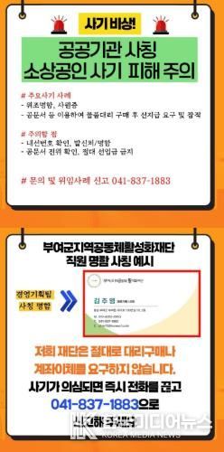 [ 한국미디어뉴스 이원영 기자 ] 부여군 지역공동체활성화재단은 최근 재단 직원을 사칭하여 물품 구매를 요청하는 의심 사례가 확인됨에 따라, 지역 소상공인과 협력업체를 대상으로 피해 예방 안내에 나섰다고 밝혔다.