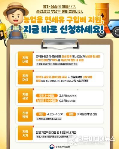 [ 한국미디어뉴스 김홍철 기자 ] 농림축산식품부는 최근 중동 지역 정세 불안으로 인한 국제유가 상승에 대응하기 위하여 농업인의 유류비 부담을 완화, 농가 경영 안정을 지원하기 위해 '농업용 면세유 유가연동 보조금 지원사업'을 추진한다고 밝혔다.