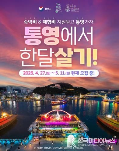 [ 한국미디어뉴스 김홍철 기자 ] 통영시는 체류형 관광 활성화와 지역 경제 활성화를 위해 ‘통영애(愛)온나(2026년 경남에서 한 달 여행하기)’사업 1차 참가자를 오는 5월 11일까지 모집한다.
