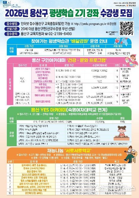 [ 한국미디어뉴스 이원영 기자 ] 서울 용산구가 구민의 자기계발과 평생학습 참여 기회 확대를 위해 ‘2026년 평생학습 2기 강좌’를 본격적으로 운영하고, 수강생 모집에 나섰다.
