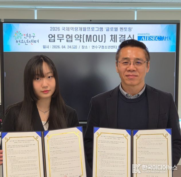 [ 한국미디어뉴스 이원영 기자 ] (재)연수구청소년재단 연수구청소년센터는 지난 24일 센터에서 AIESEC in INHA와 ‘2026 국제역량 개발 프로그램 글로벌 멘토링’을 위한 업무협약(MOU)을 체결했다.