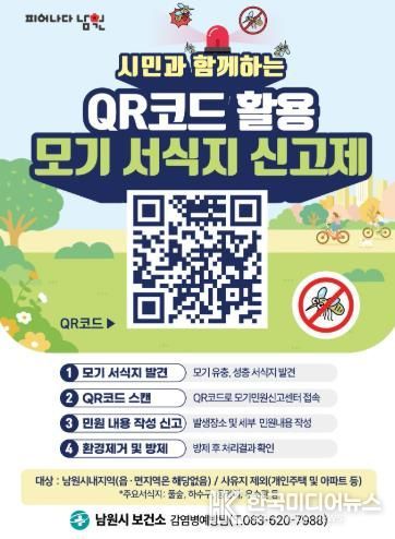 [ 한국미디어뉴스 이종철 기자 ] 남원시보건소가 여름철 모기 매개 감염병 예방과 시민 편의를 위해 스마트폰 GPS 위치 정보를 활용한 'QR코드 모기 서식지 신고제'를 운영한다고 밝혔다.