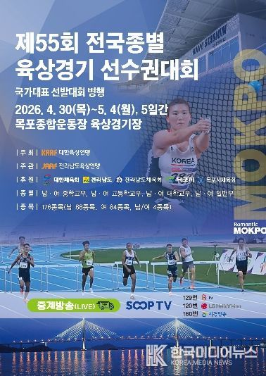 [ 한국미디어뉴스 이종철 기자 ] 목포시는 오는 4월 30일부터 5월 4일까지 5일간 목포종합경기장에서 ‘제55회 전국종별육상경기선수권대회’와 ‘2026 아시아투척선수권대회’를 개최한다고 밝혔다.
