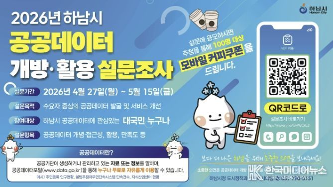 [ 한국미디어뉴스 김서안 기자 ] 하남시는 시민과 기업, 연구기관 등 다양한 수요자의 의견을 반영해 공공데이터 개방 및 활용을 확대하고자 ‘2026년 하남시 공공데이터 설문조사’를 실시한다고 밝혔다.