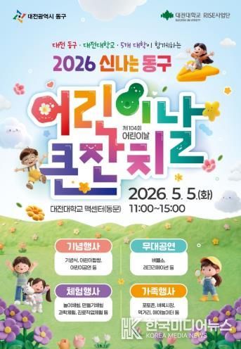 [ 한국미디어뉴스 이원영 기자 ] 대전 동구는 제104회 어린이날을 맞아 오는 5월 5일 오전 11시부터 대전대학교 맥센터 실내체육관에서 ‘동구 미래의 주인공들과 함께하는 어린이날 큰잔치’를 개최한다고 28일 밝혔다.