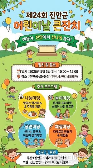 [ 한국미디어뉴스 이종철 기자 ] 진안군지역아동센터연합회는 제24회 어린이날을 맞아 오는 5월 5일 오전 10시부터 진안공설운동장(우천 시 반다비체육관)에서 ‘어린이날 큰잔치’를 개최한다.