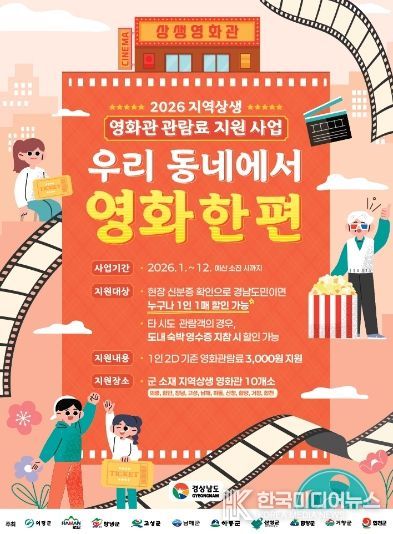 [ 한국미디어뉴스 김홍철 기자 ] 거창군은 다가오는 5월 가정의 달을 맞이해 군민들의 문화 향유 기회를 확대하고 지역 영화관의 활성화를 돕기 위해 ‘2026년 지역상생 영화관 관람료 지원사업’을 시행한다.