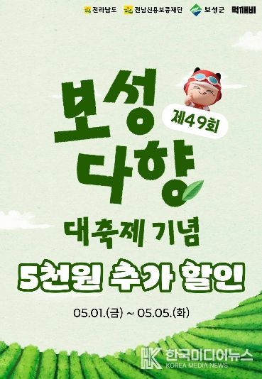 [ 한국미디어뉴스 이종철 기자 ] 보성군은 제49회 보성다향대축제를 맞아 5월 1일부터 5일간 공공배달앱 ‘먹깨비’를 활용한 추가 할인 행사를 진행한다고 밝혔다.