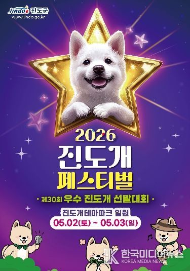 [ 한국미디어뉴스 이종철 기자 ] 진도군이 오는 5월 2일부터 3일까지 이틀간 진도개테마파크에서 ‘진도개의 고향, 진도개테마파크에서의 만남’을 주제로 ‘2026 진도개 페스티벌’과 ‘제30회 우수 진도개 선발대회’을 동시에 개최한다.
