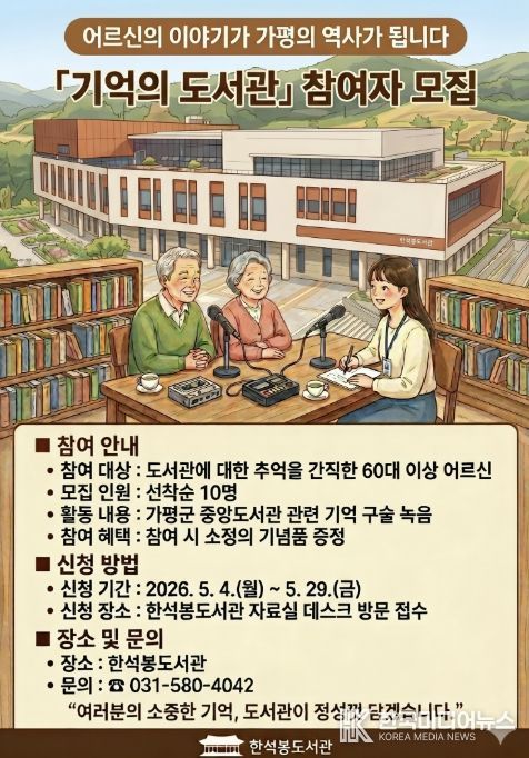 [ 한국미디어뉴스 김서안 기자 ] 가평군 한석봉도서관이 오는 5월부터 어르신들의 생생한 목소리로 지역의 옛 기록을 수집하는 ‘기억의 도서관’ 프로그램을 운영한다. 실버층 특화 사업인 ‘말랑말랑 추억 교실’의 일환으로 추진되는 이번 사업은 지역 문화 자산을 확보하고 세대 간 기억을 공유하고자 기획됐다.