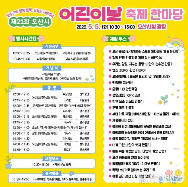 [ 한국미디어뉴스 이보영 기자 ] 오산시는 오는 5월 5일 어린이날을 맞아 오산시청 광장에서 ‘제21회 오산시 어린이날 축제 한마당’을 개최한다고 밝혔다.