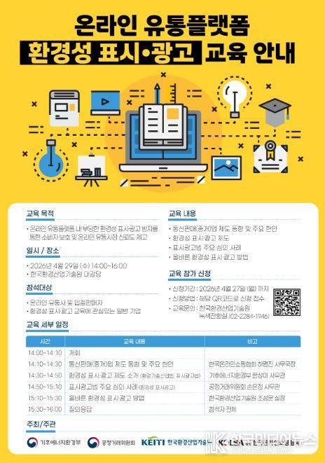 [ 한국미디어뉴스 이원영 기자 ] 공정거래위원회와 기후에너지환경부는 4월 29일 한국환경산업기술원 대강당(서울 은평구 소재)에서 온라인 유통사를 대상으로 ‘환경성 표시·광고 교육’을 개최한다고 밝혔다.