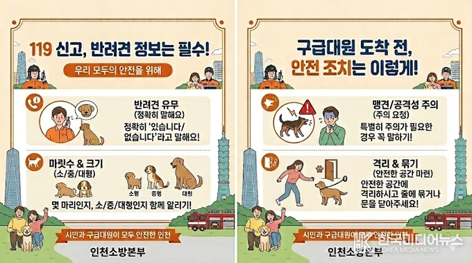 [ 한국미디어뉴스 이원영 기자 ] 인천소방본부(본부장 임원섭)는 반려동물 양육 가구의 급격한 증가에 발맞춰, 현장 구급대원의 안전사고를 예방하고 신속한 응급처치 환경을 조성하기 위한 ‘119 구급활동 반려견 안전관리 대책’을 시행한다고 밝혔다.